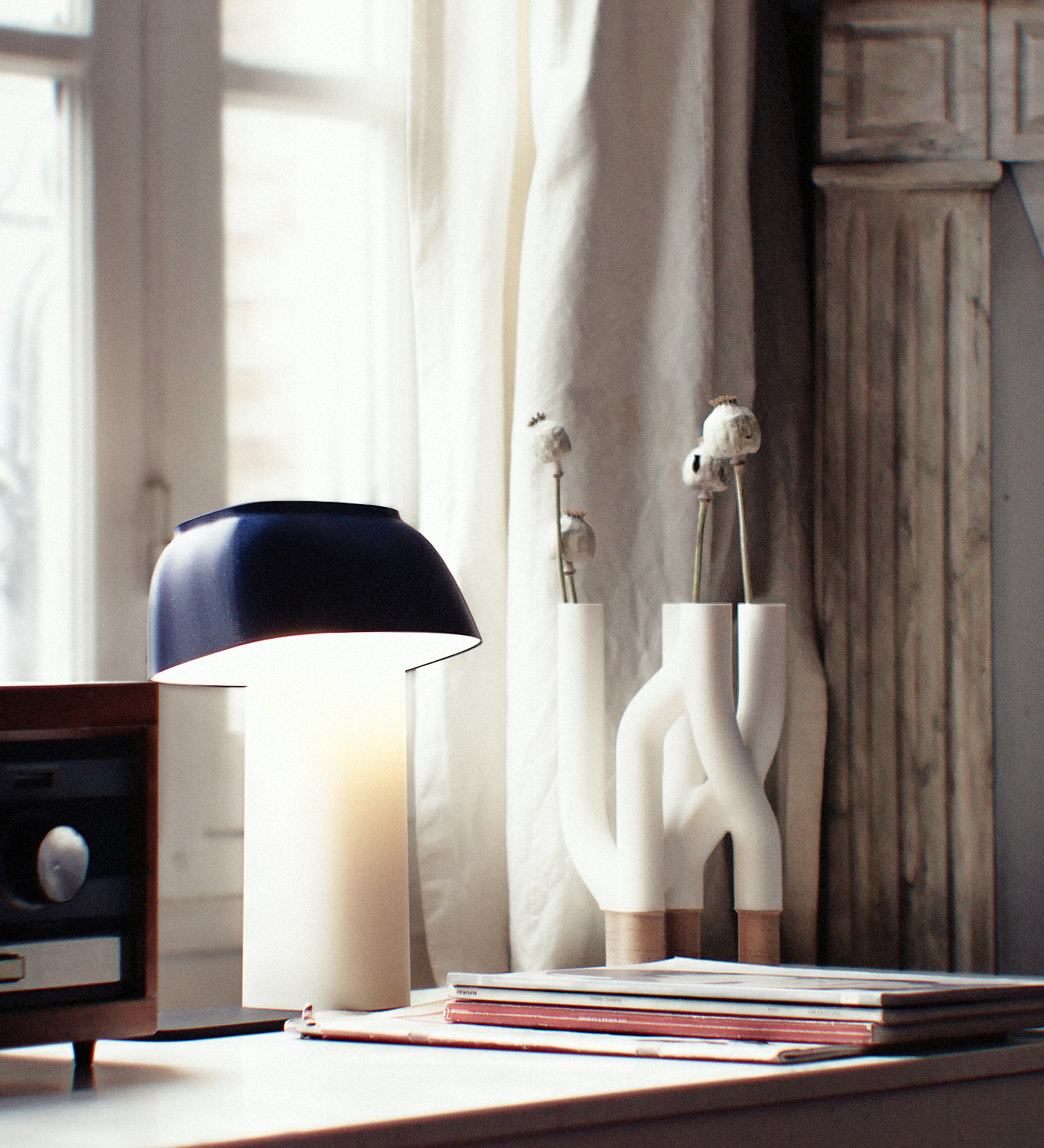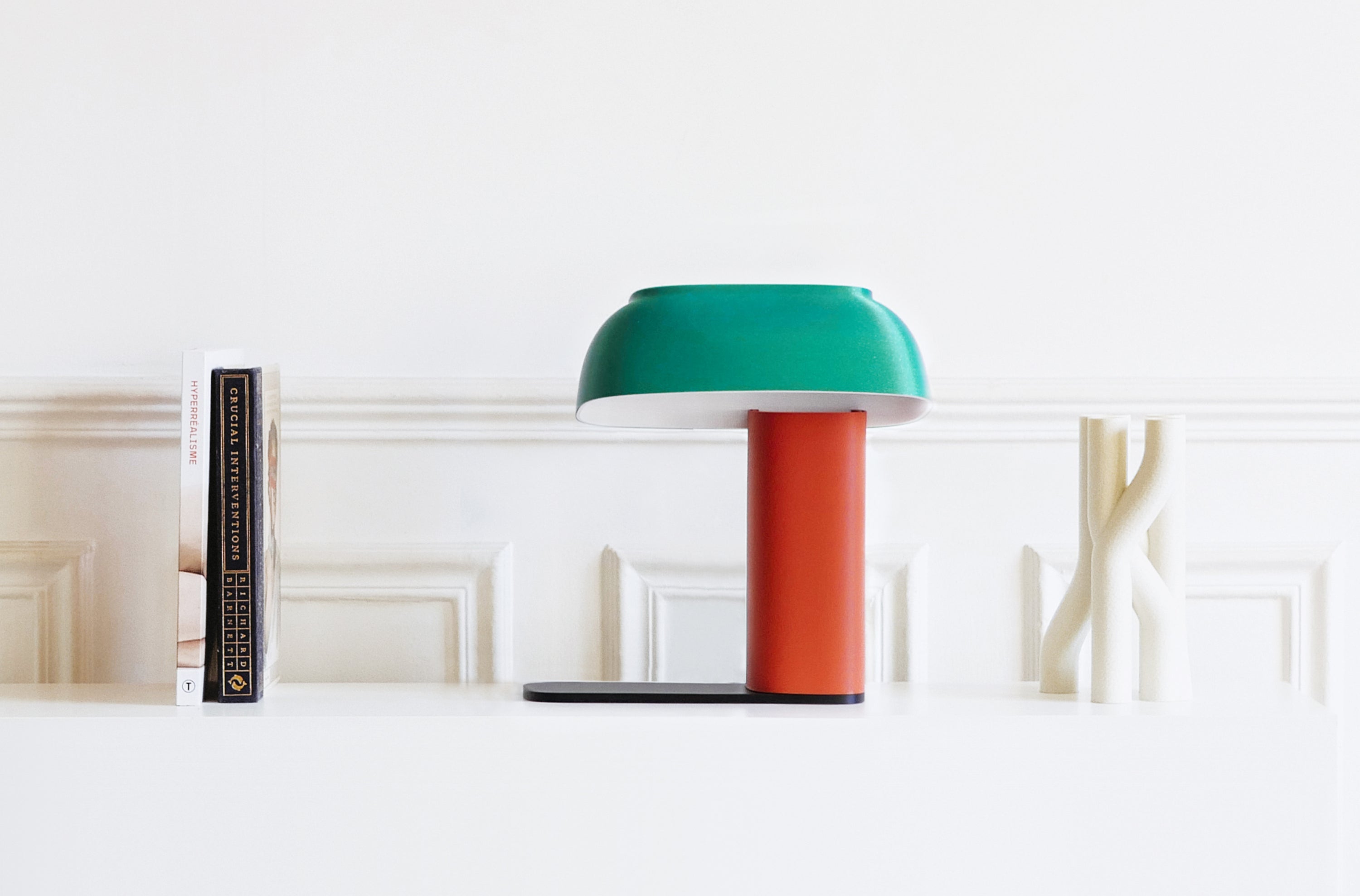 La lampe mrlt est une relecture de l'Eméralite créée en 1915. Elle reprend la forme de l'abat-jour oblongue tout en ajoutant couleurs et lignes harmonieuses.
