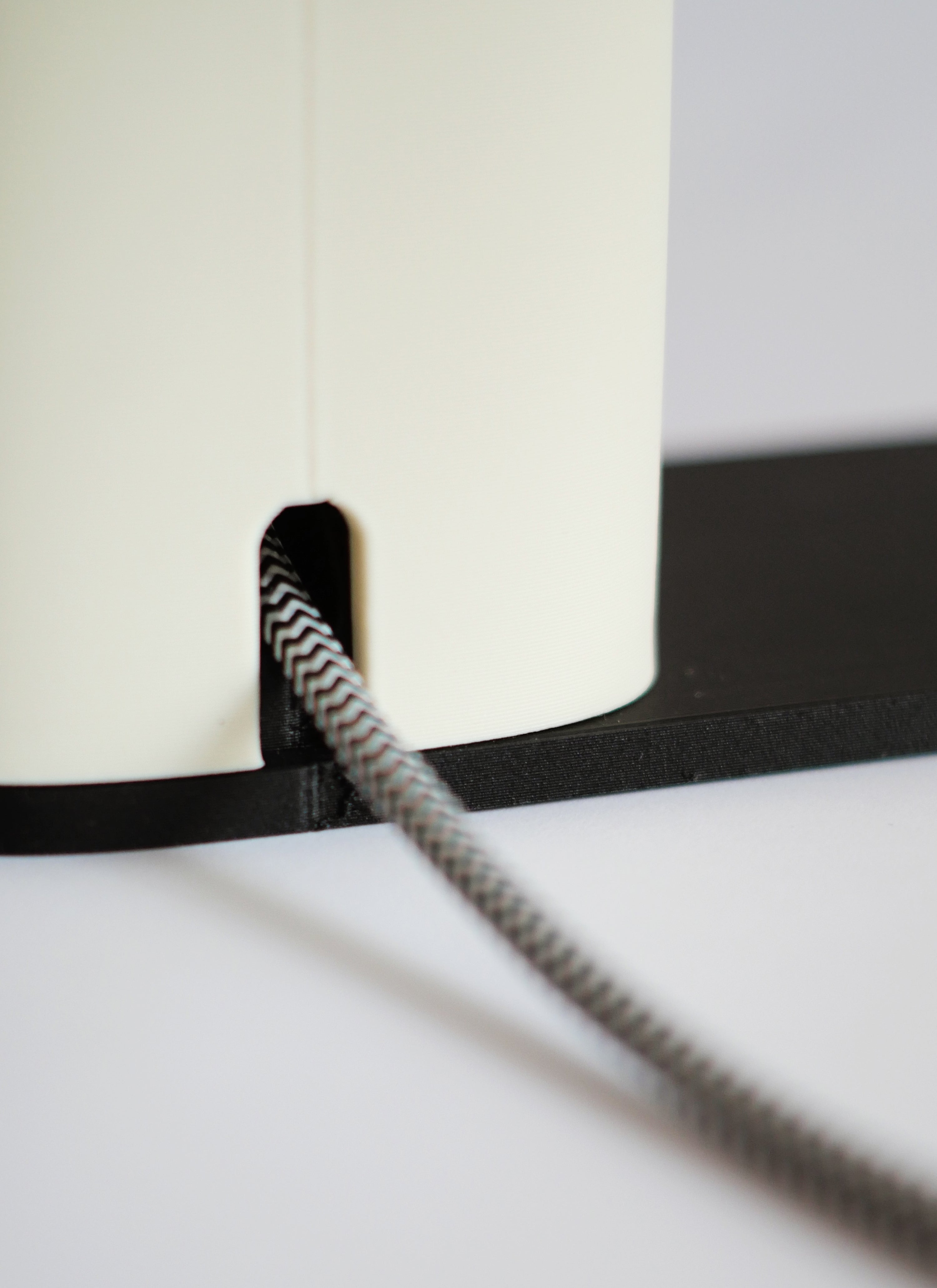 Socle noir avec câble éléctrique noir et blanc tissé.